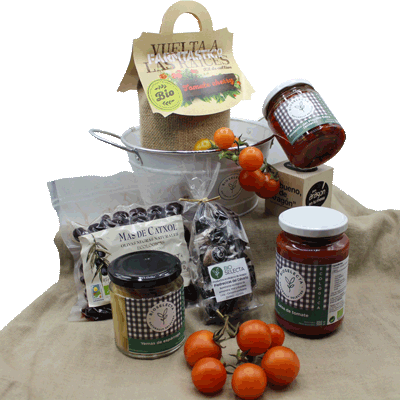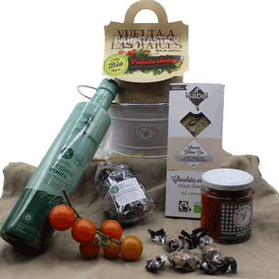 Incluye un Kit de cultivo tomates cherry y productos aragoneses ecologicos y artesanos: aceite de oliva premium, pimientos enteros del piquillo, tableta de chocolate con café arábica y bombones "piedrecicas del calvario".