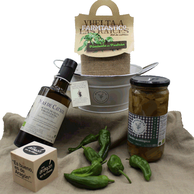 Con un Kit cultivo pimientos de padrón y productos aragoneses ecológicos y artesanos: Pimientos del piquillo, yemas de espárragos, salsa natural de tomate, aceitunas negras empeltre y bombones "piedrecicas del calvario".