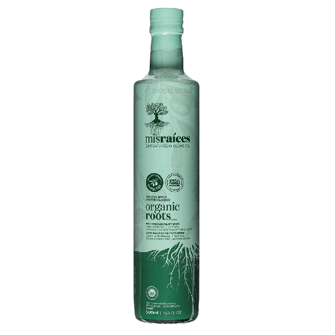 Mis Raices Organic Root es un aceite de oliva extra premium de primera extracción en frío en menos de 12h, con una acidez de 0,14%, de intensidad media con notas maduras y un toque a hierba fresca.